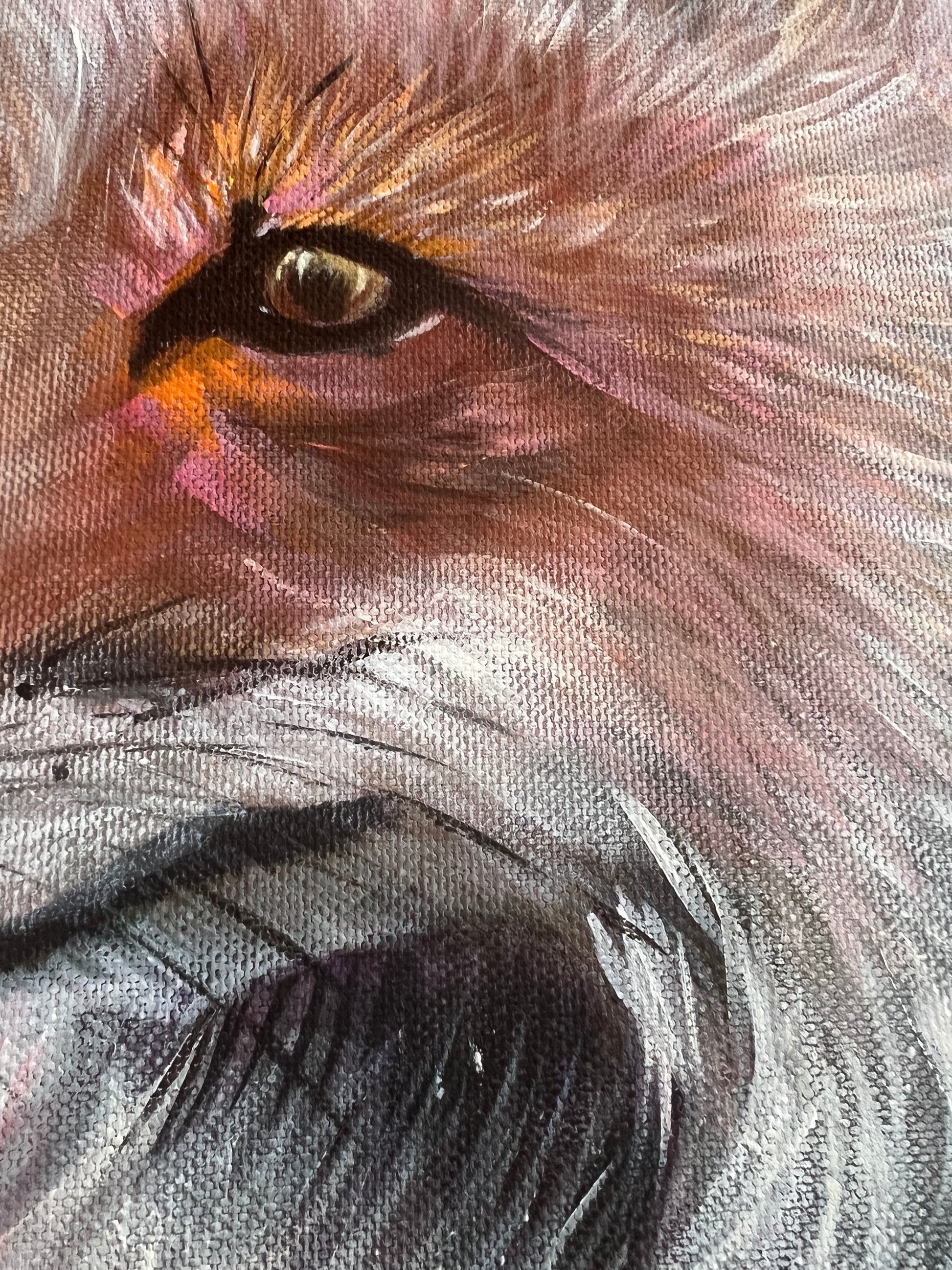 In this captivating painting, a fox stands boldly amidst a swirling landscape of abstract pink and green, reminiscent of distant mountains. Its vibrant presence embodies the sense of wonder and adventure, symbolizing a deep connection to home and self-belief.