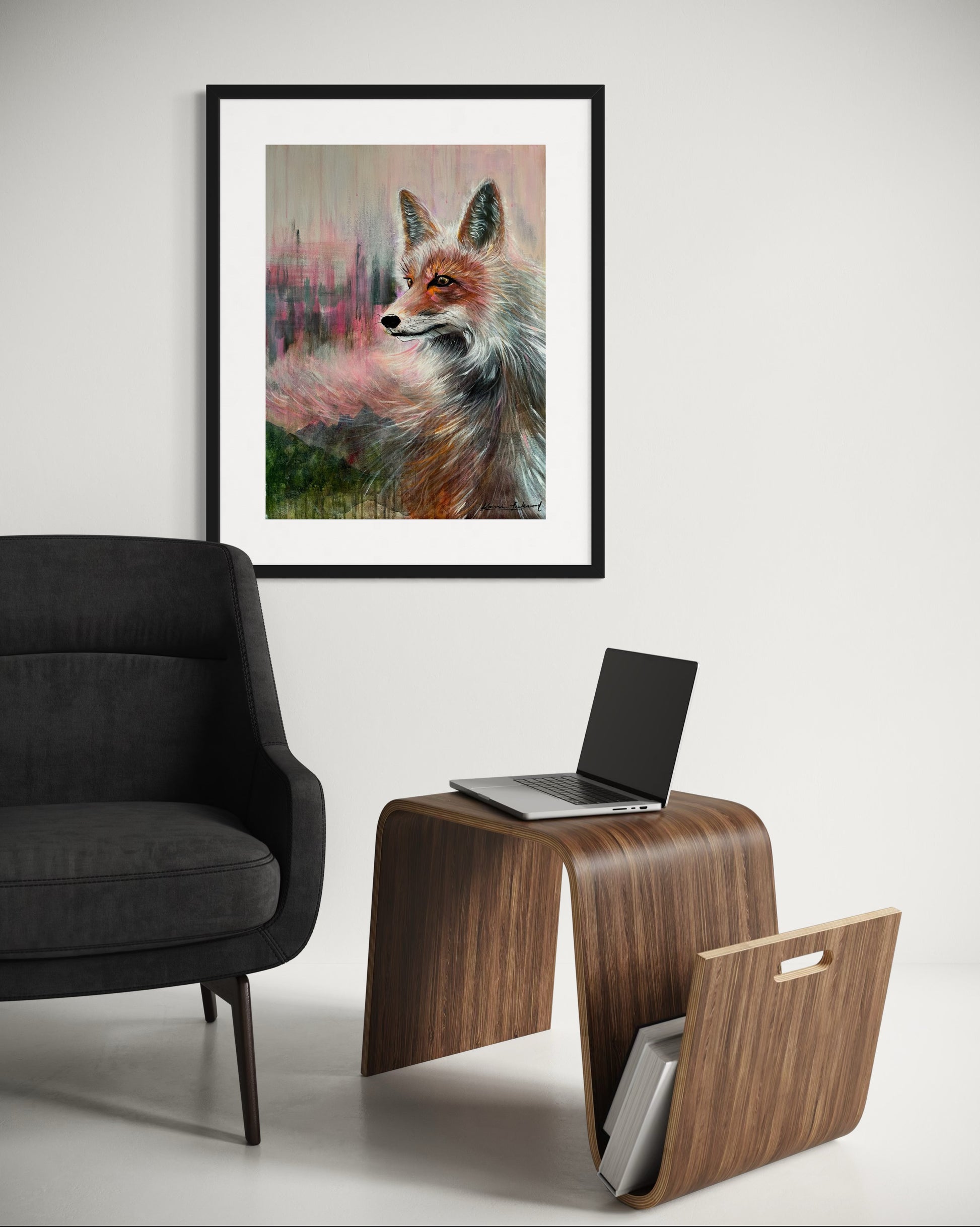 In this captivating painting, a fox stands boldly amidst a swirling landscape of abstract pink and green, reminiscent of distant mountains. Its vibrant presence embodies the sense of wonder and adventure, symbolizing a deep connection to home and self-belief.