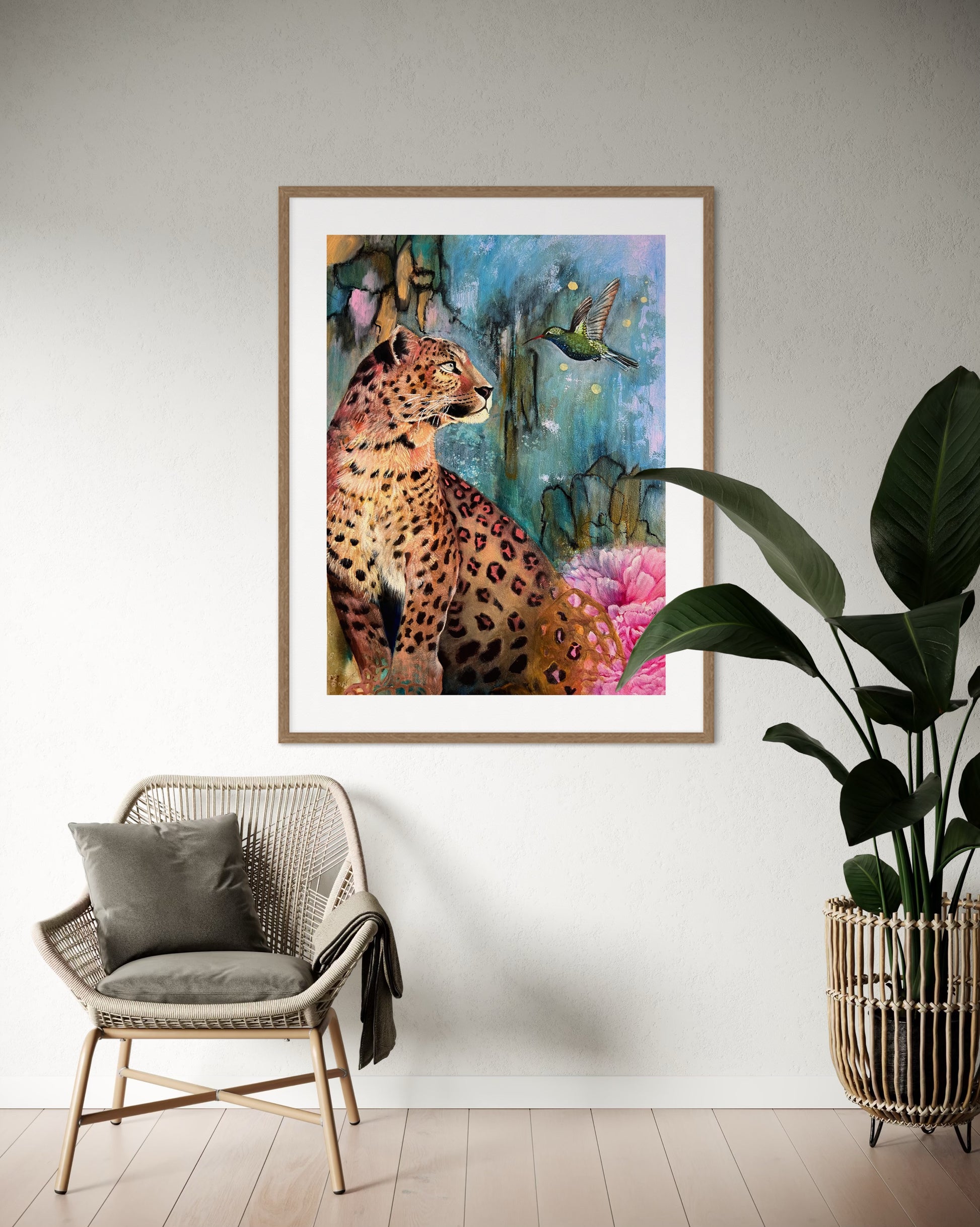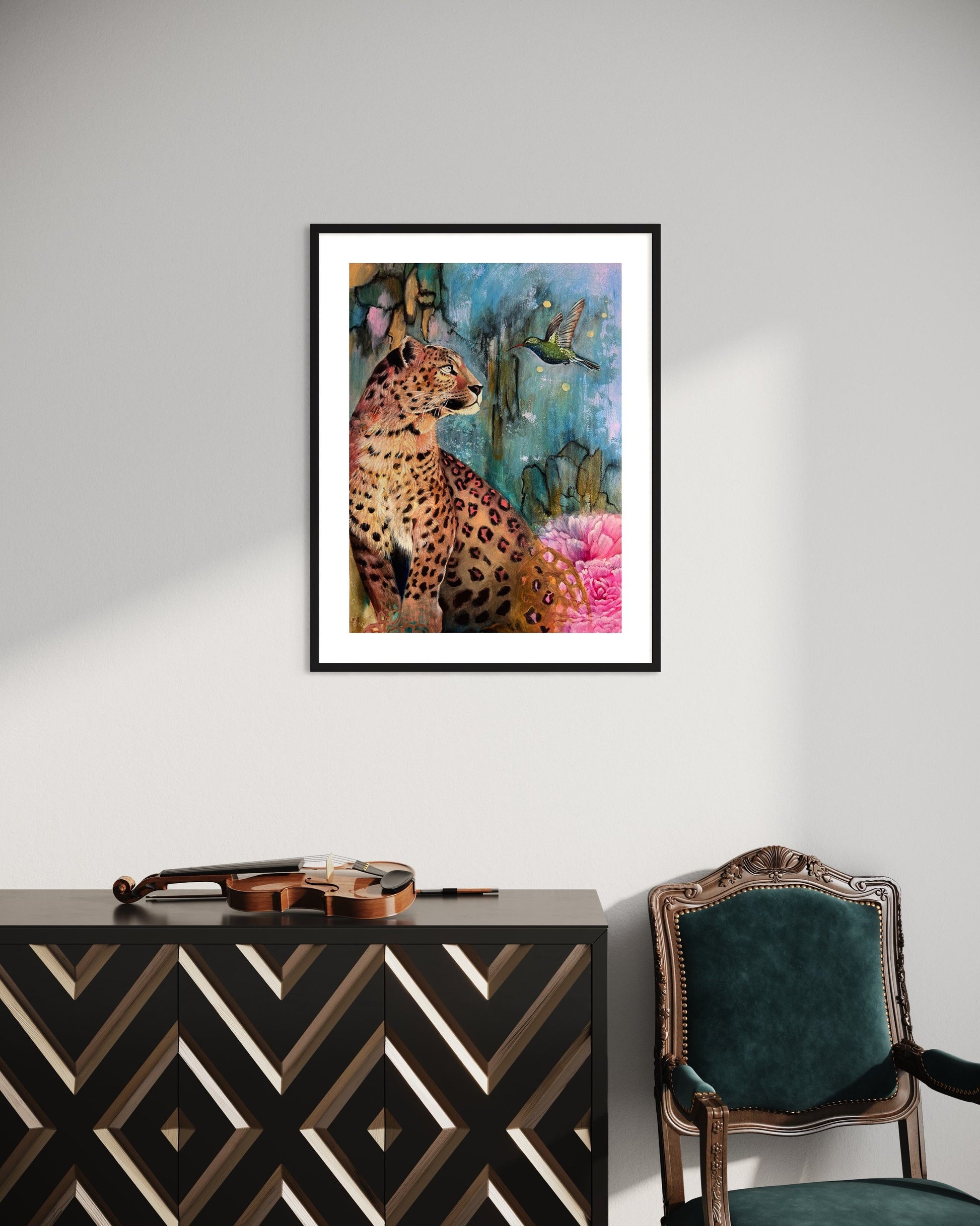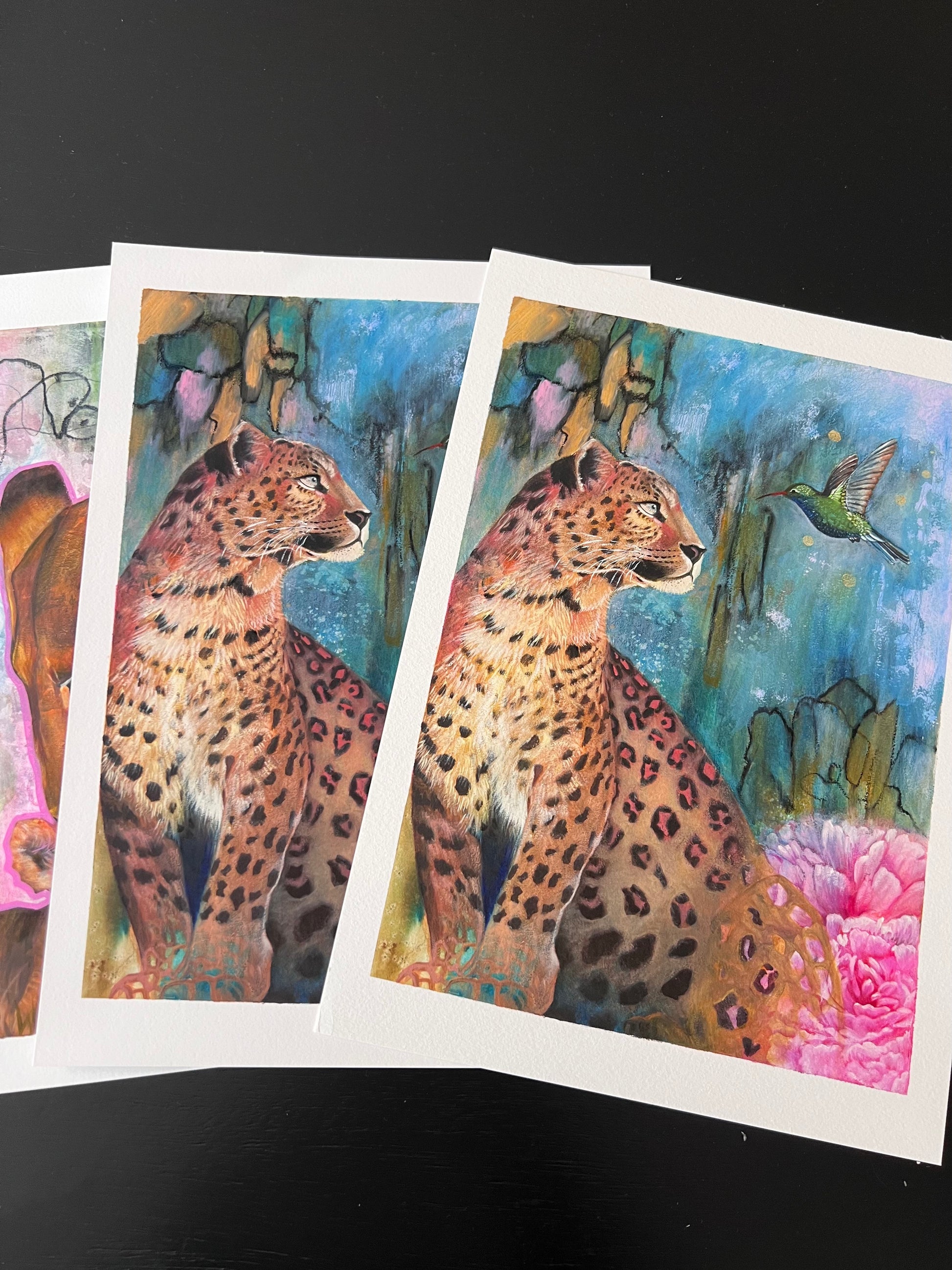 A soulful mixed media animal art print featuring a leopard and hummingbird, Inner Spark celebrates intuition, inspiration, and the beauty of self-discovery. Layers of ink, acrylic, and oil create a vibrant, symbolic wildlife painting that invites reflection and connection.