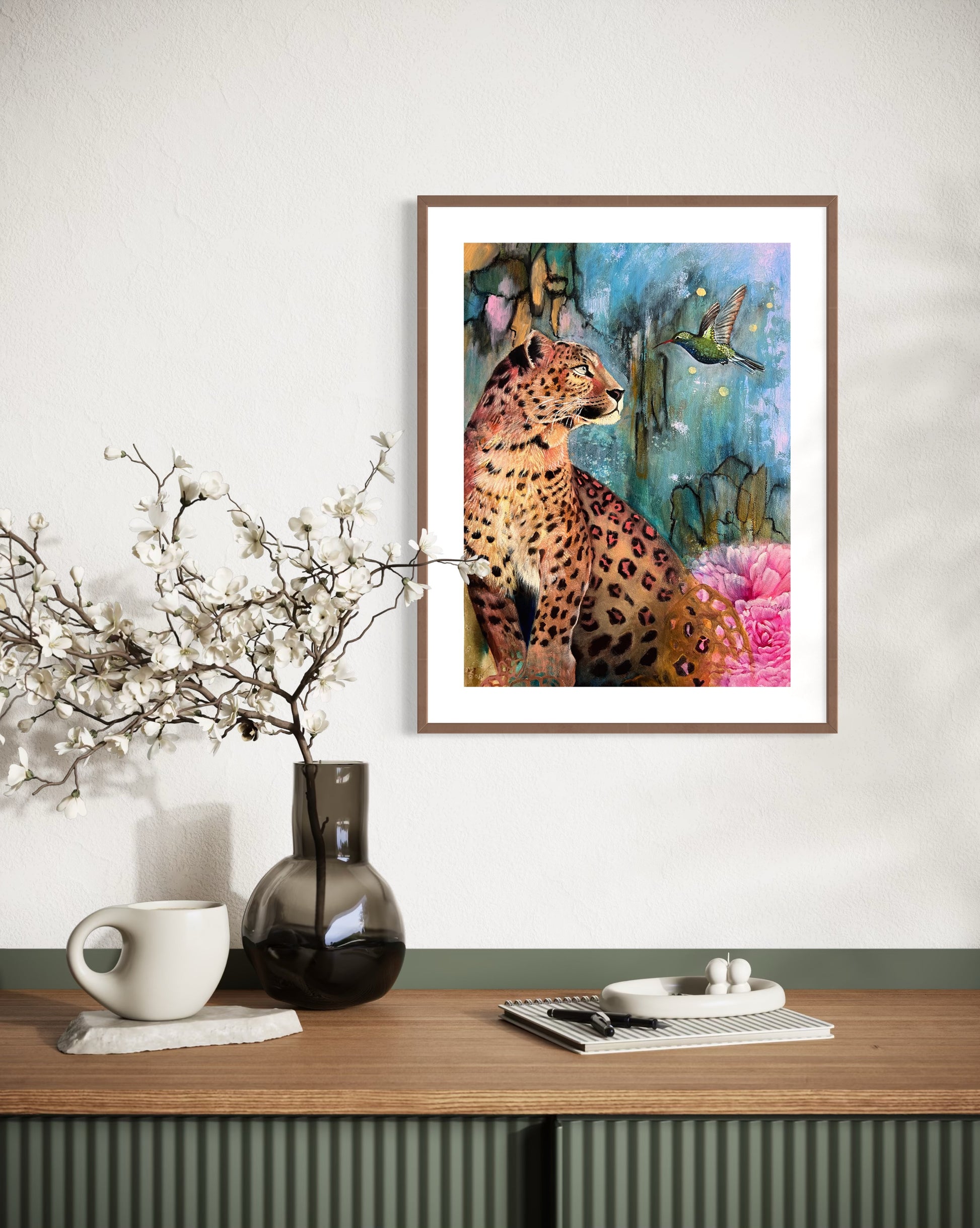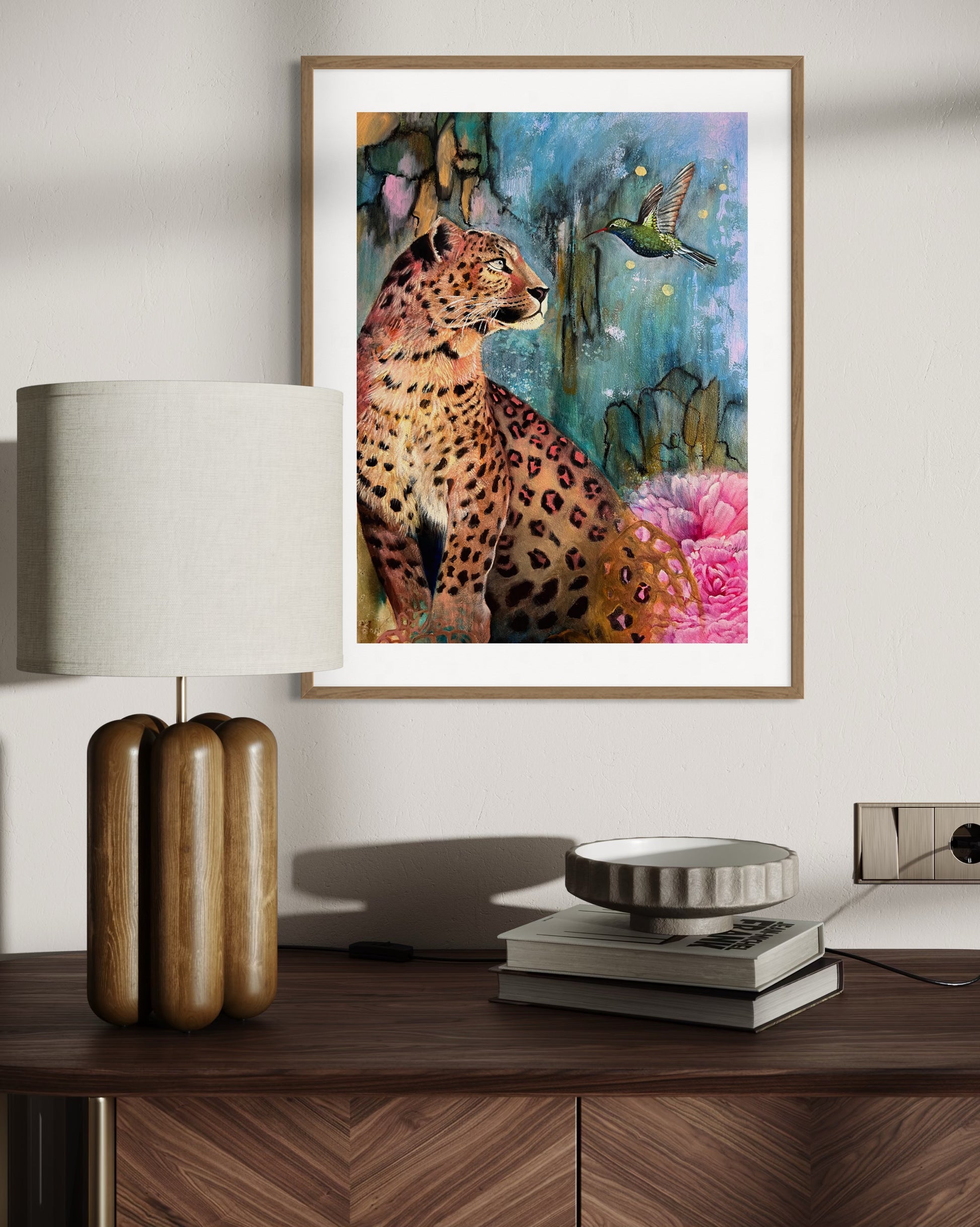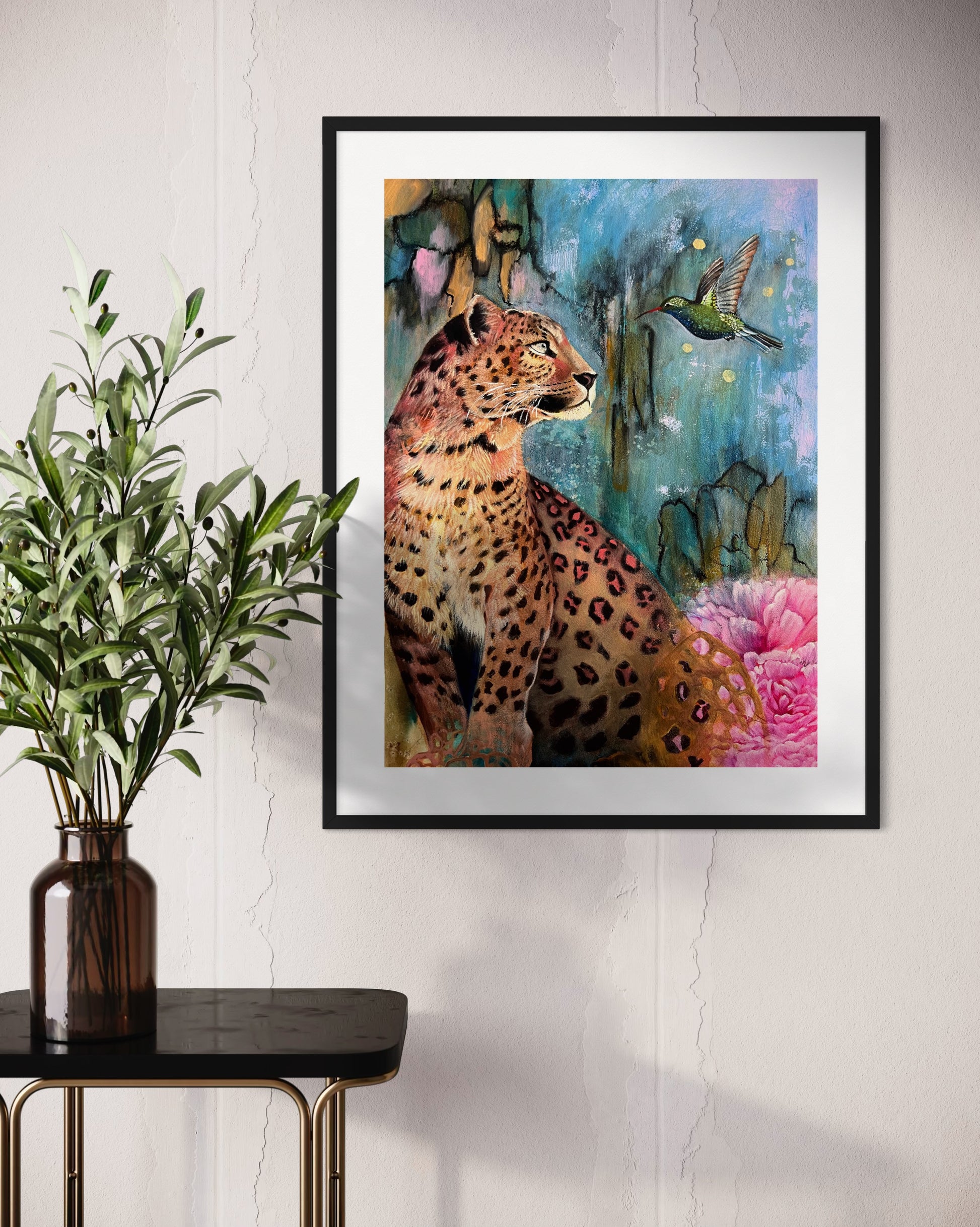 A soulful mixed media animal art print featuring a leopard and hummingbird, Inner Spark celebrates intuition, inspiration, and the beauty of self-discovery. Layers of ink, acrylic, and oil create a vibrant, symbolic wildlife painting that invites reflection and connection.