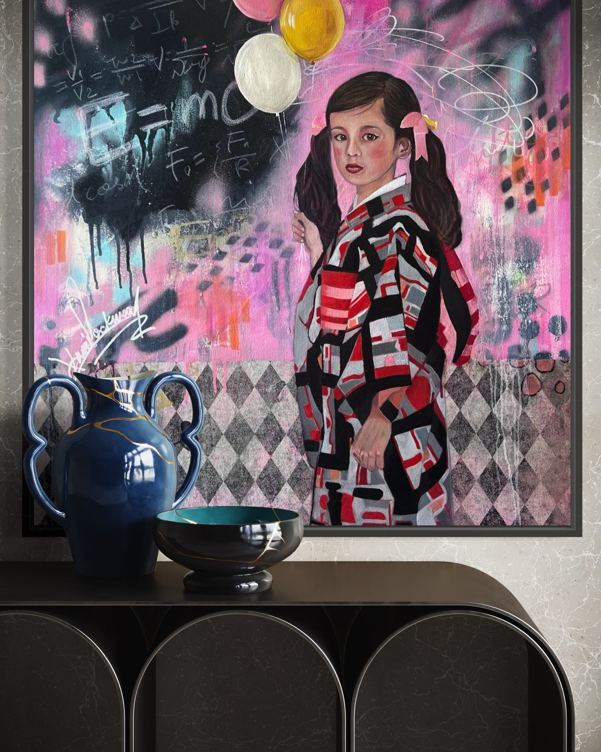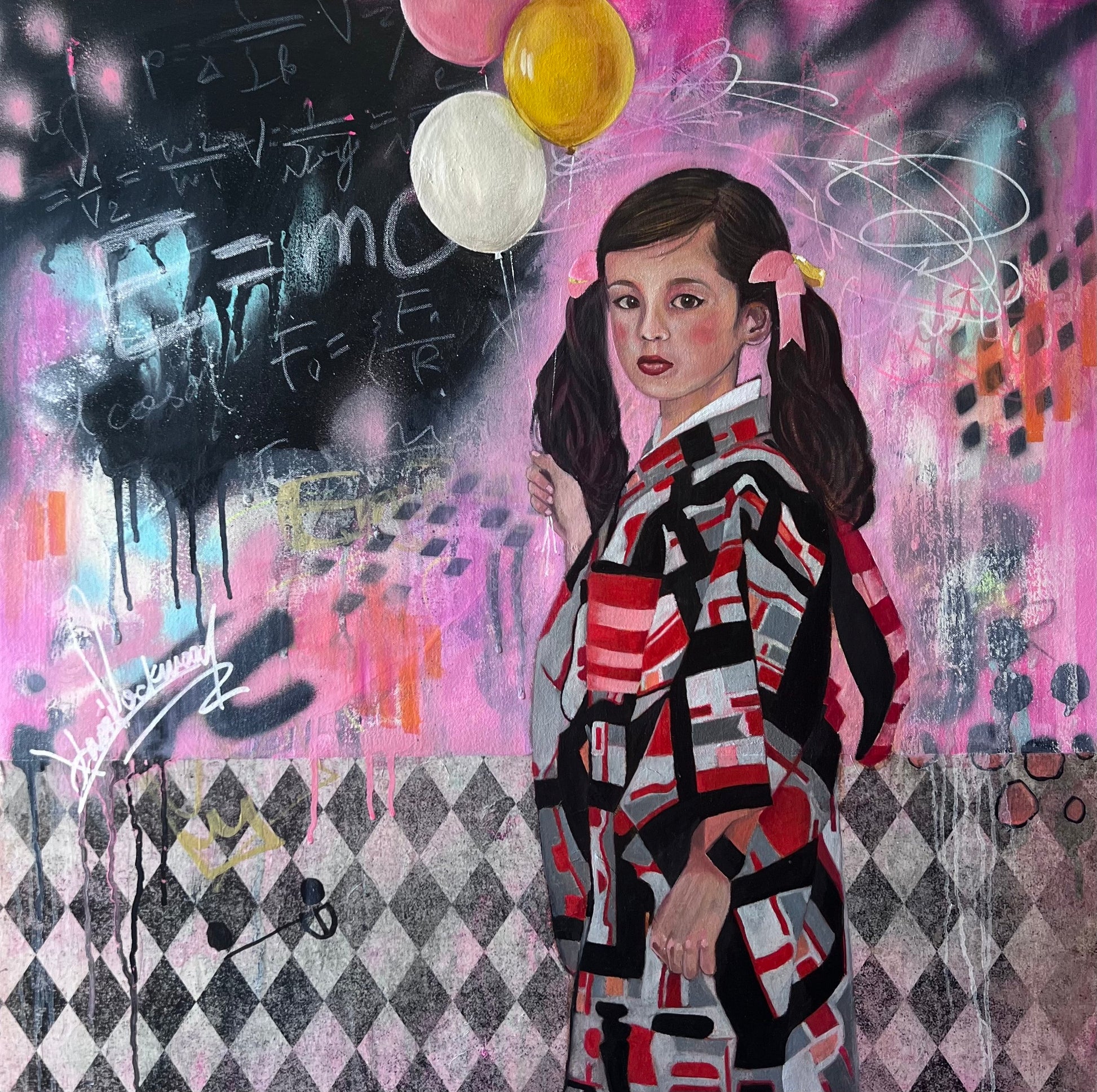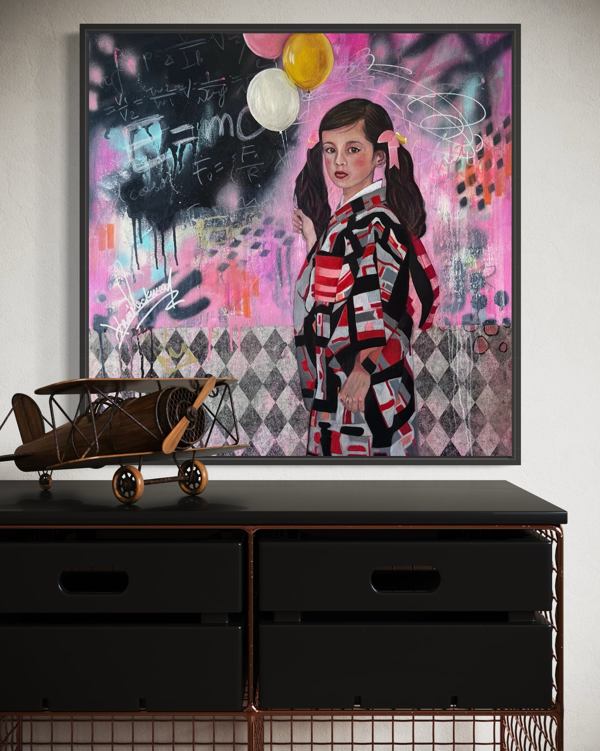 This painting is a reflection of that contrast. The girl with the balloon embodies the innocence and joy of self-expression, while the vibrant graffiti behind her captures the beautiful chaos of childhood—messy, unpredictable, and full of potential. But then, there are the mathematical equations, a symbol of the growing weight of responsibility, structure, and the need to fit into society’s mold.