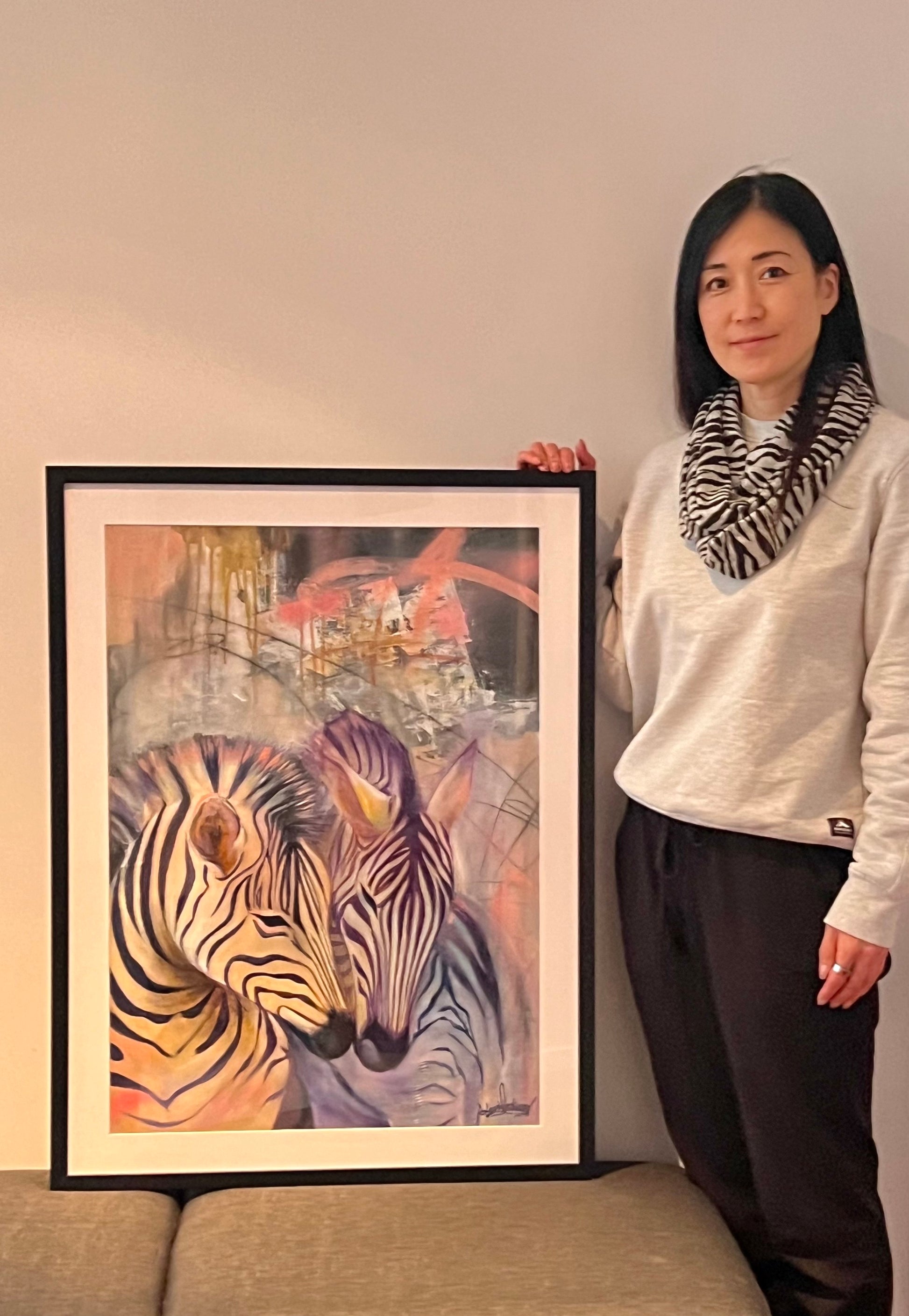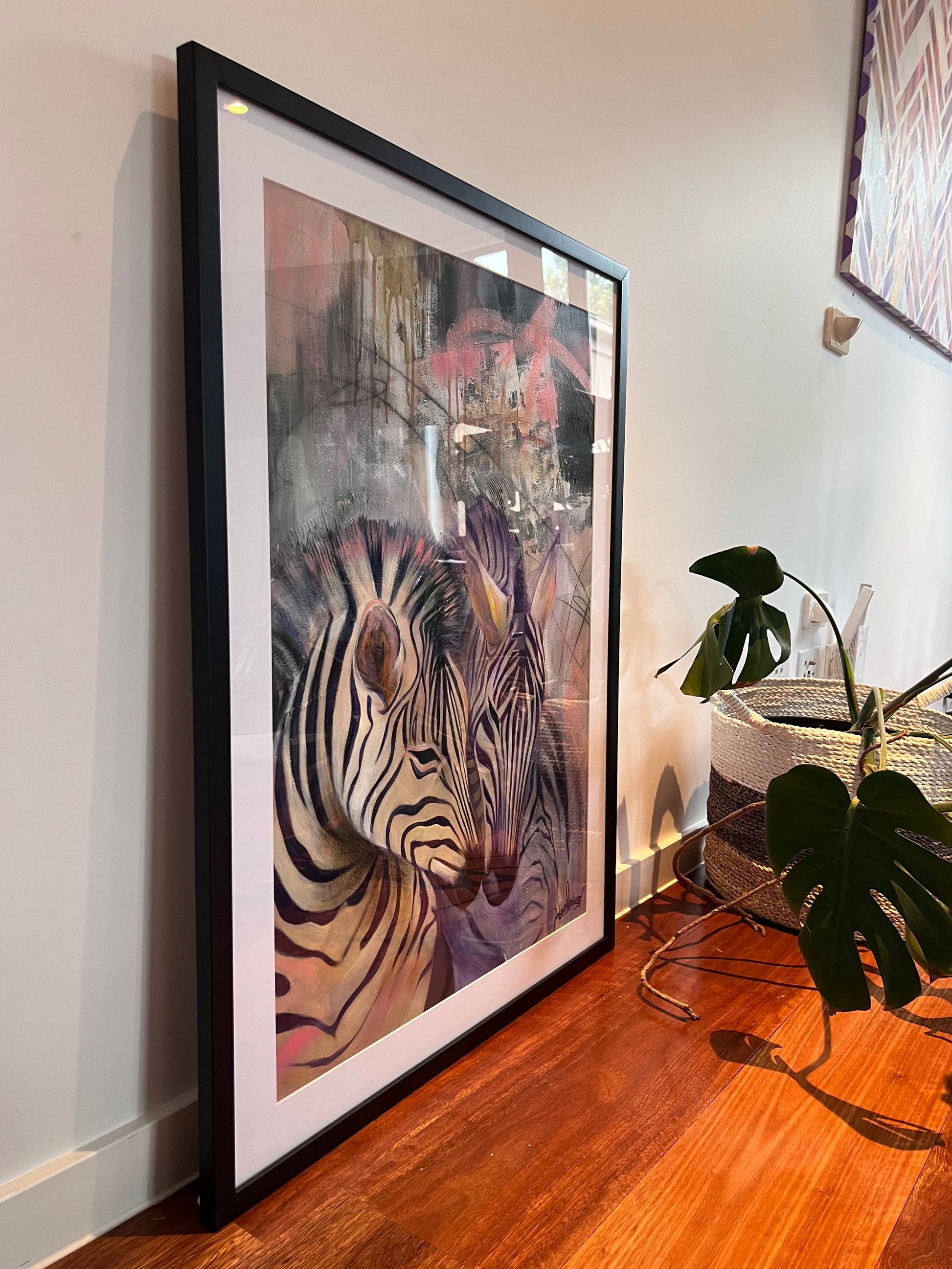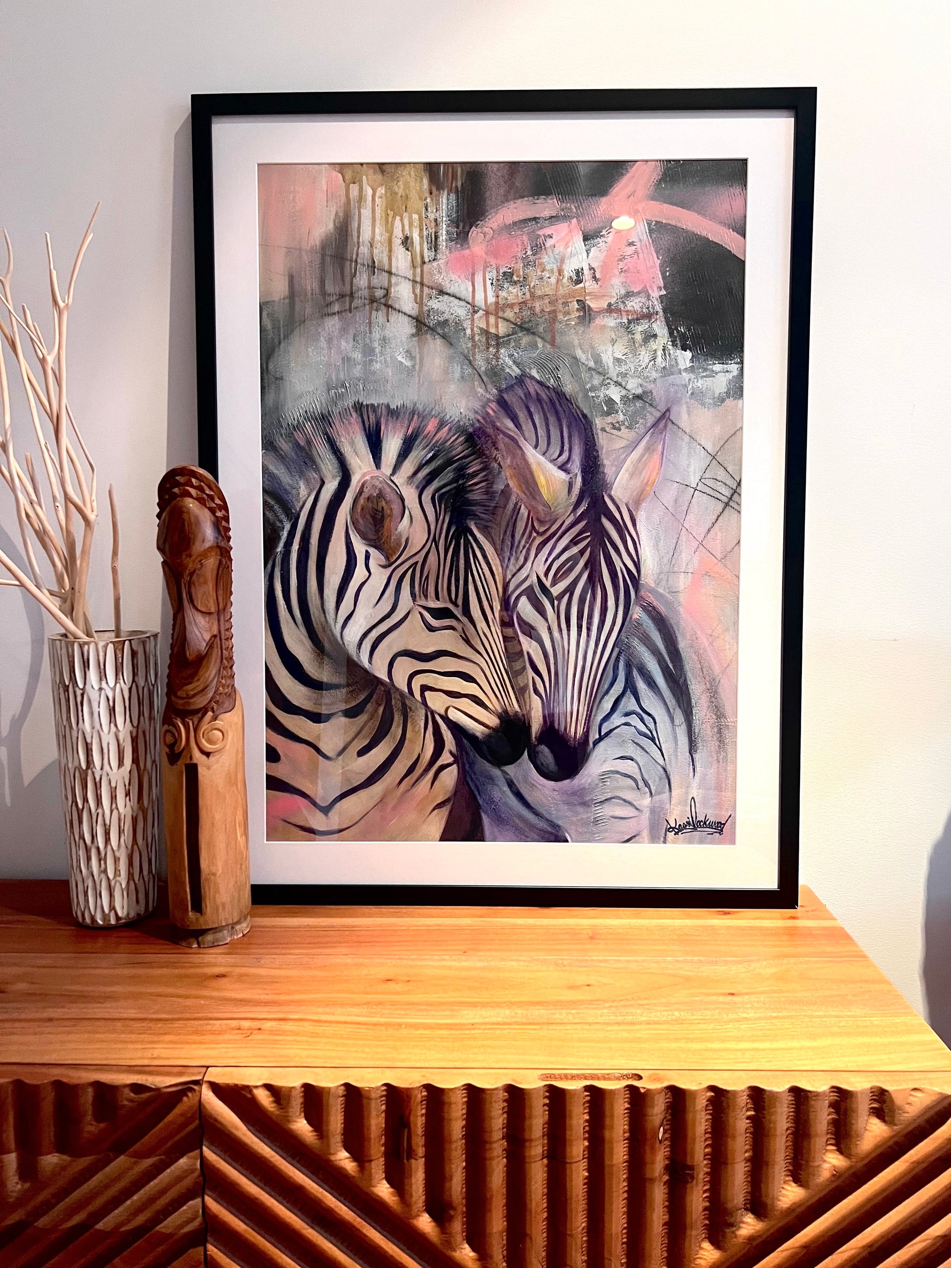 The story unfolds in the viewer's heart. Illuminated by a gentle aura of yellow and purple, the zebras bask in a soft, comforting light, embodying the essence of gentle caregiving. And amidst it all, a playful hint of pink infuses the scene with a touch of lighthearted sweetness—a reminder that even in the midst of care, there is joy.