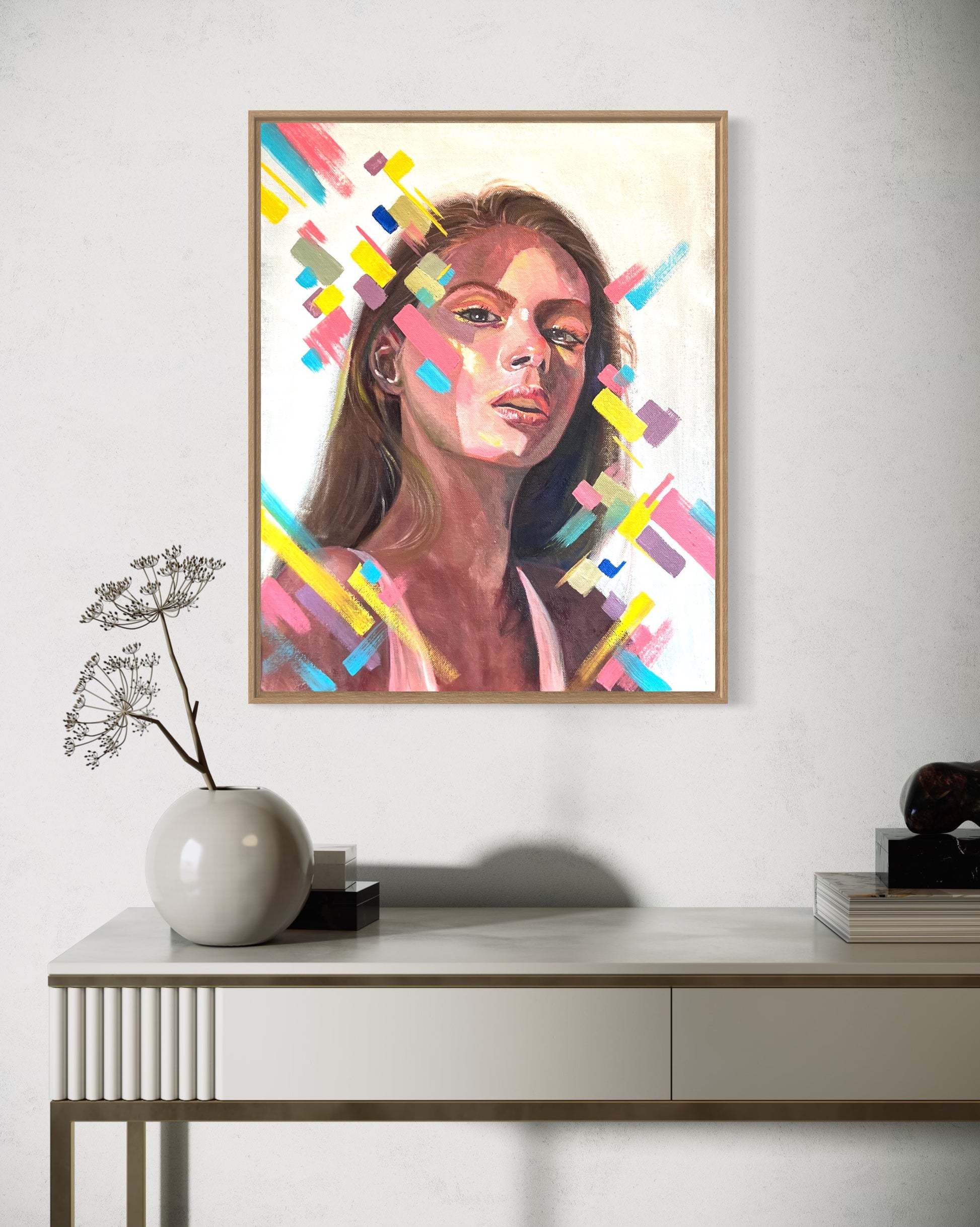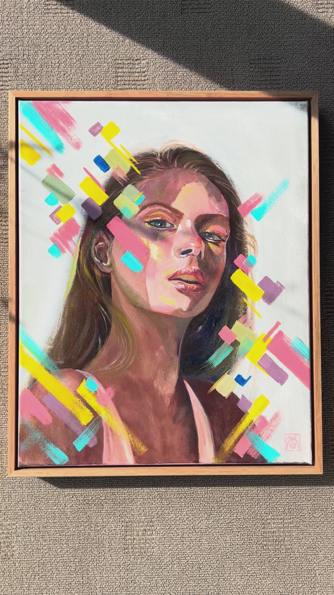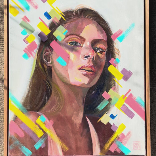 "Vivid Gaze" is a striking oil painting that captures the strength and confidence of its subject through a dynamic interplay of light and color. The portrait exudes a powerful presence, with the subject’s gaze boldly meeting the viewer's, surrounded by vibrant abstract elements that seem to pulse with energy. This piece celebrates individuality and resilience, making it a captivating focal point in any space. "Vivid Gaze" invites you to explore the layers of emotion and character within, while the colorful strokes add a modern, energetic twist to classic portraiture.